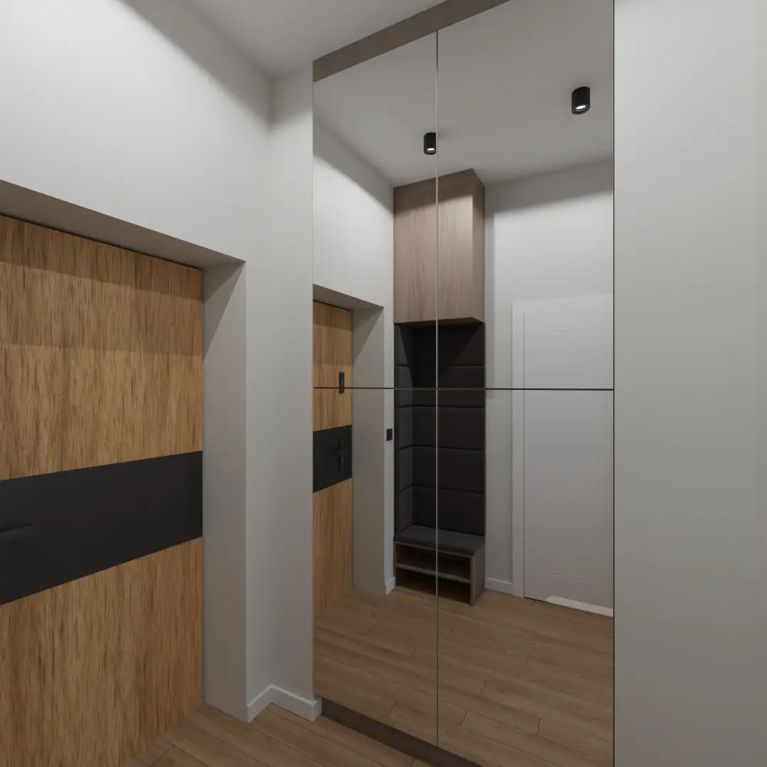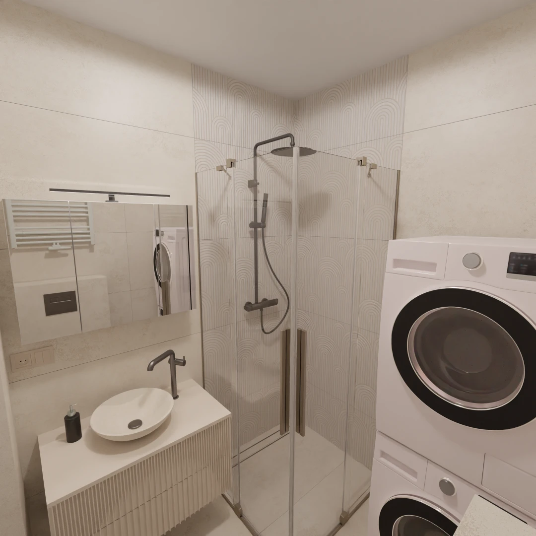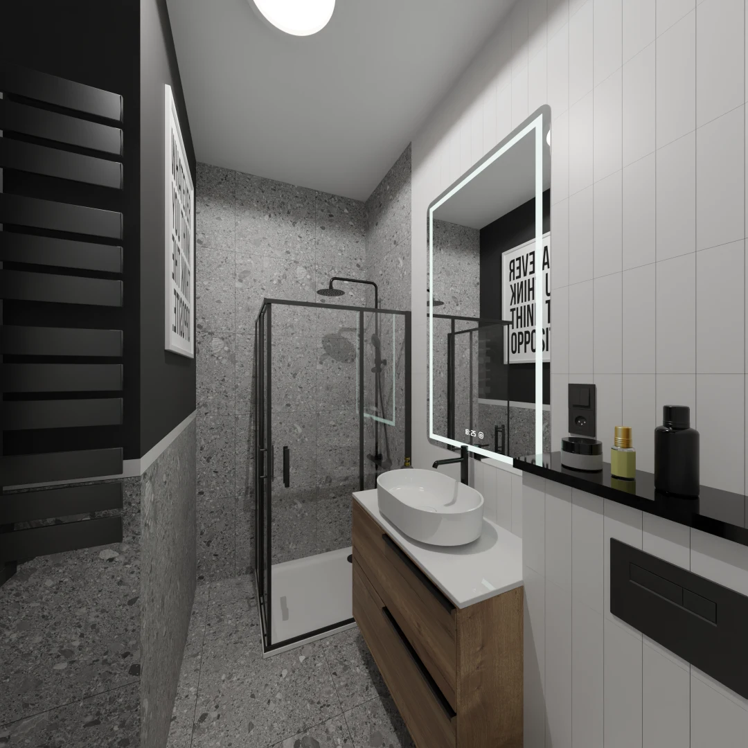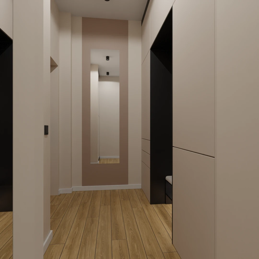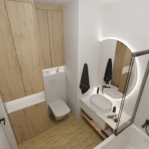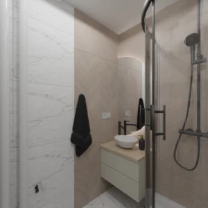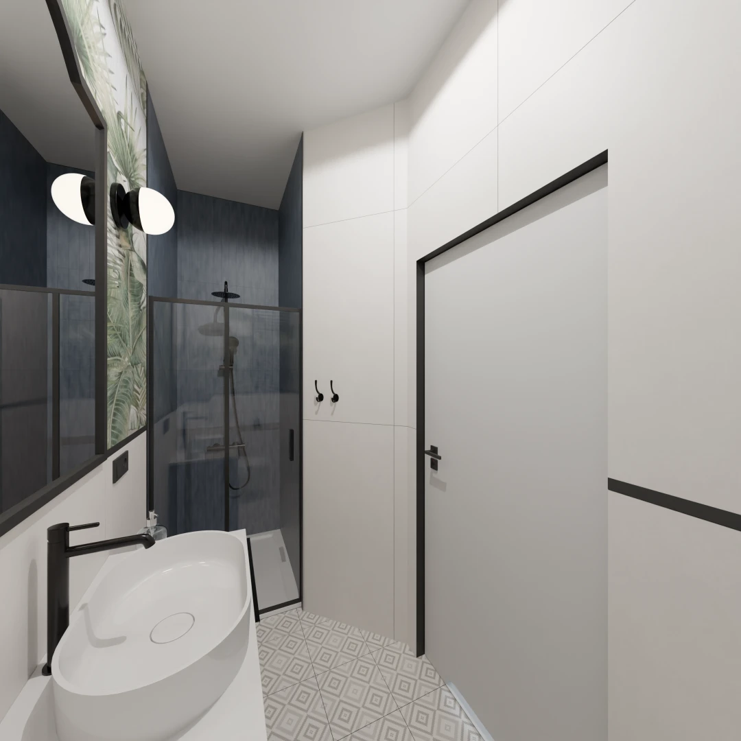 Projekt mieszkania 44m2 obejmował Zmiana układu funkcjonalnego + lifting łazienki z zachowaniem płytek w łazience i części wyposażenia