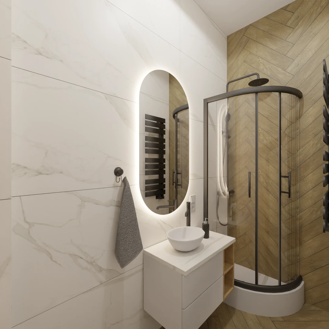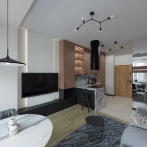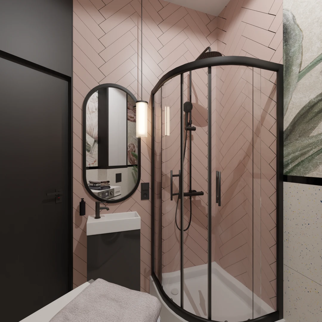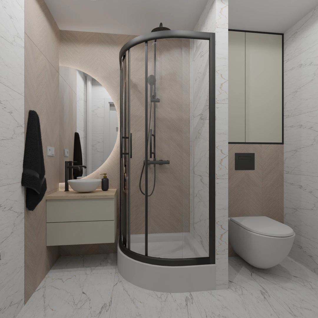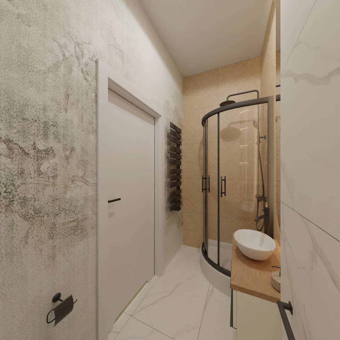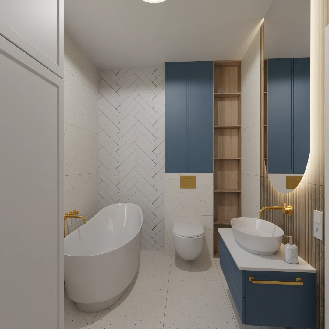 Projekt mieszkania 44m2 obejmował Zmiana układu funkcjonalnego + lifting łazienki z zachowaniem płytek w łazience i części wyposażenia