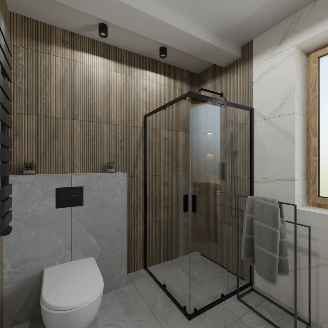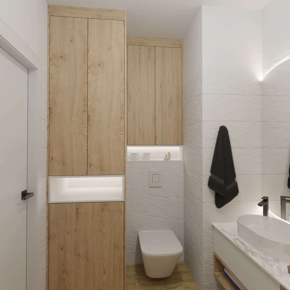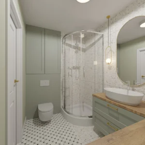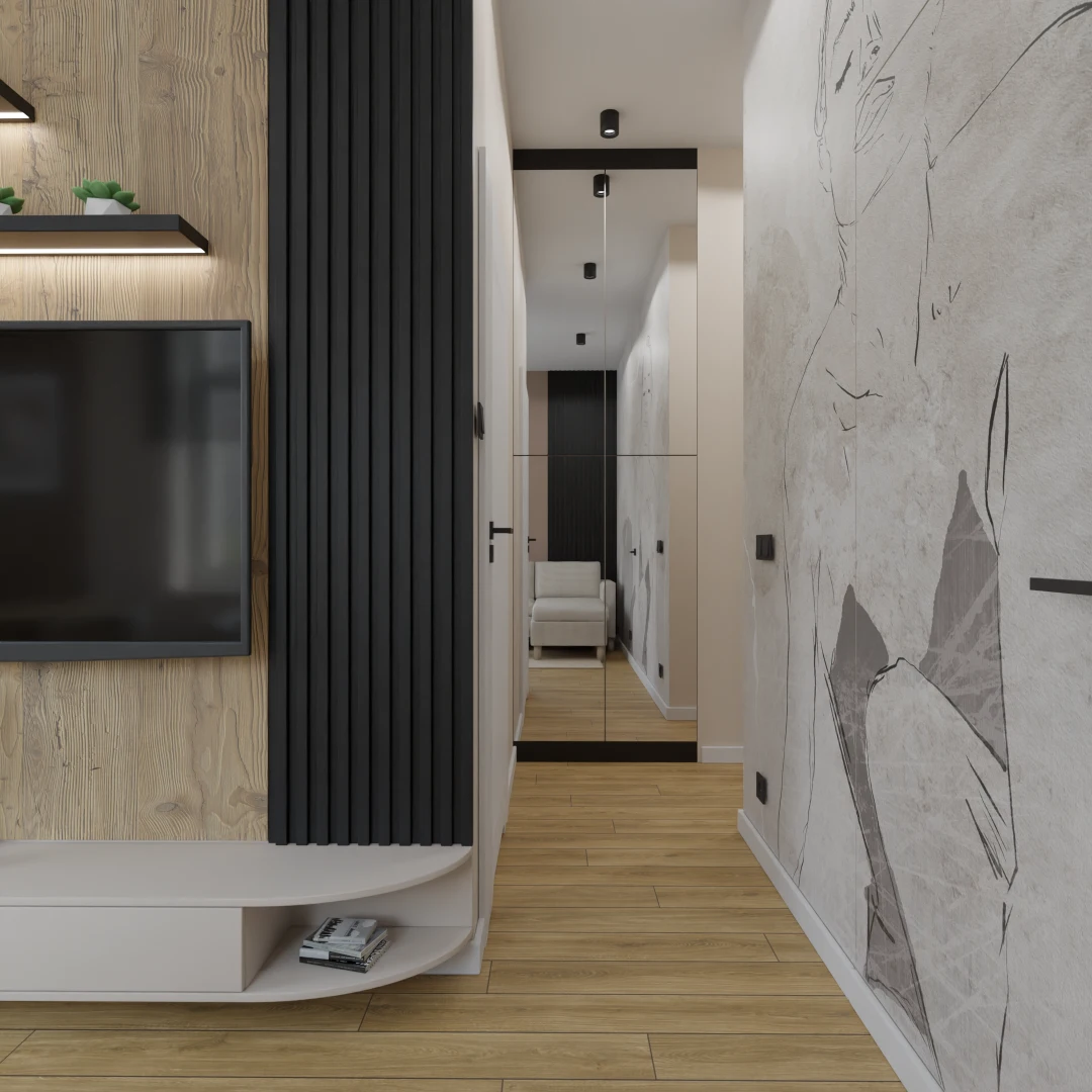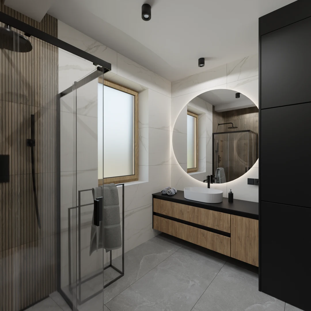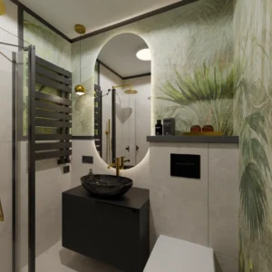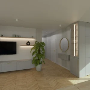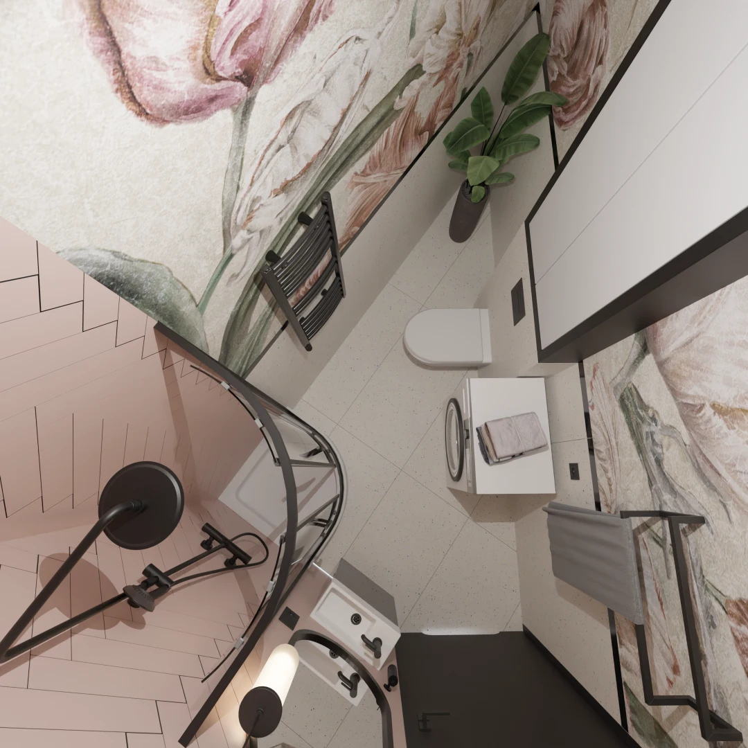Projekt mieszkania 44m2 obejmował Zmiana układu funkcjonalnego + lifting łazienki z zachowaniem płytek w łazience i części wyposażenia