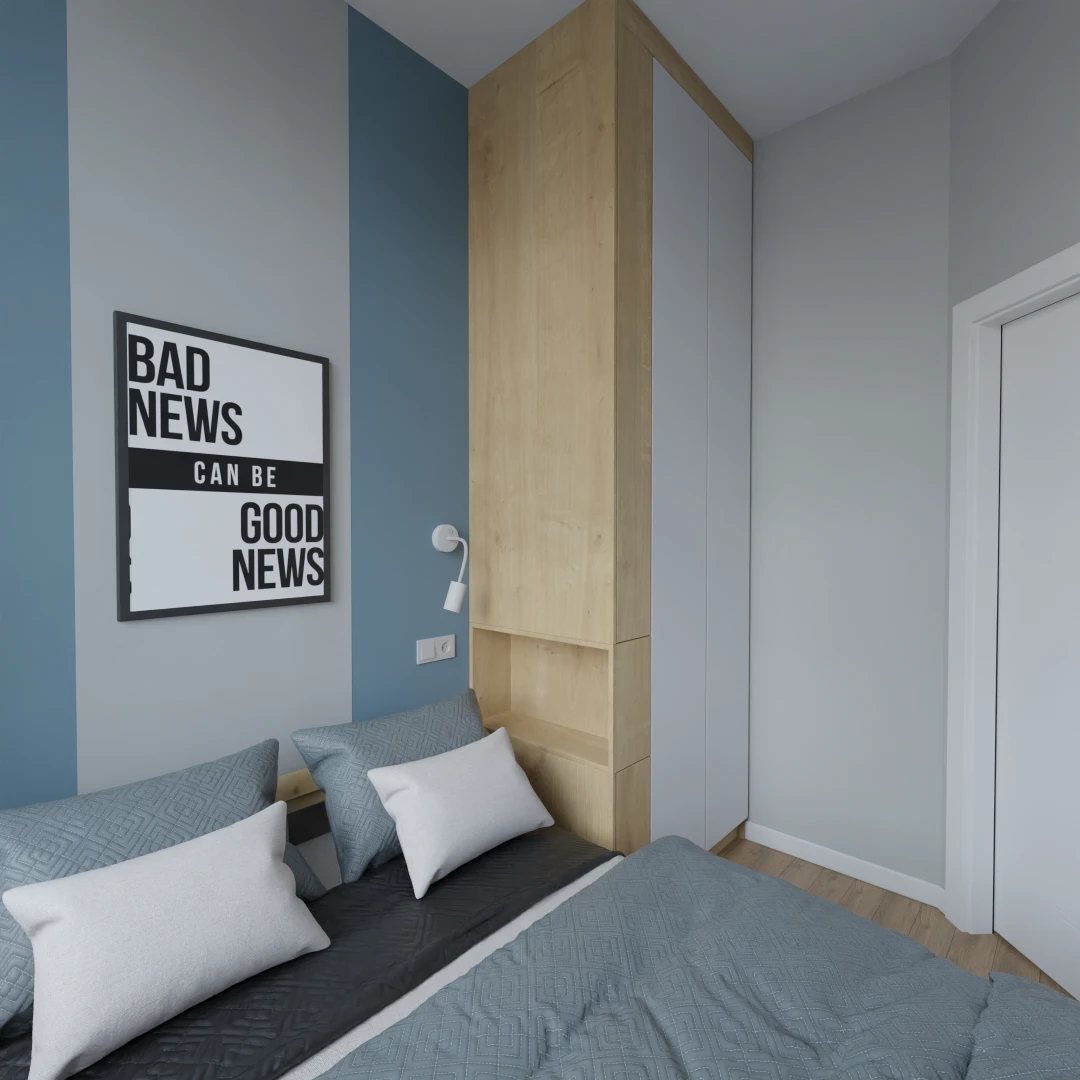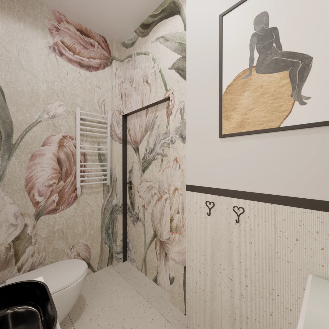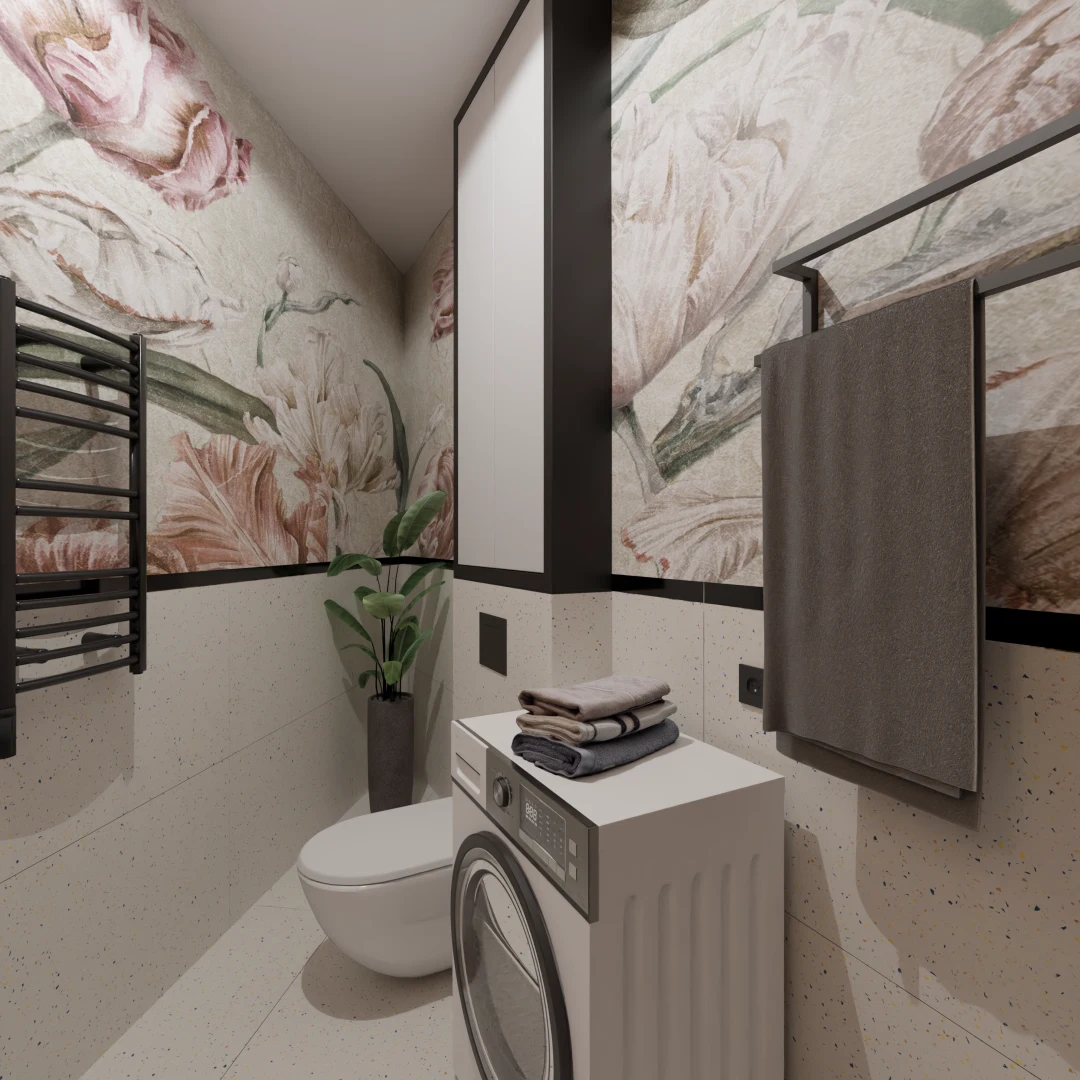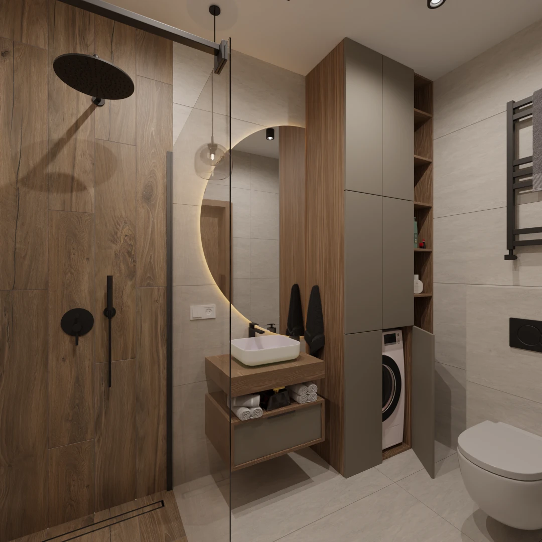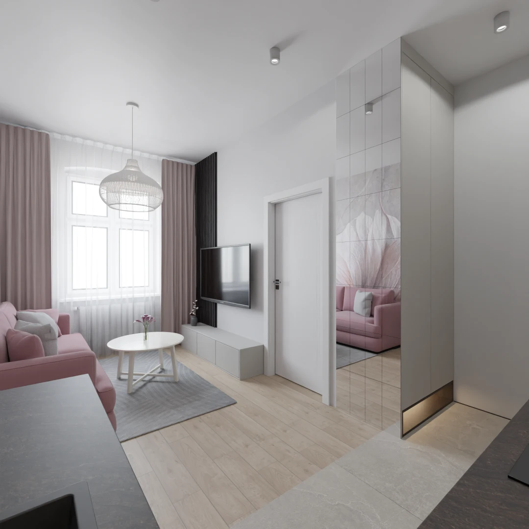 Projekt mieszkania 44m2 obejmował Zmiana układu funkcjonalnego + lifting łazienki z zachowaniem płytek w łazience i części wyposażenia