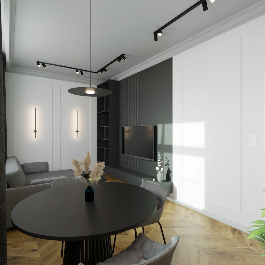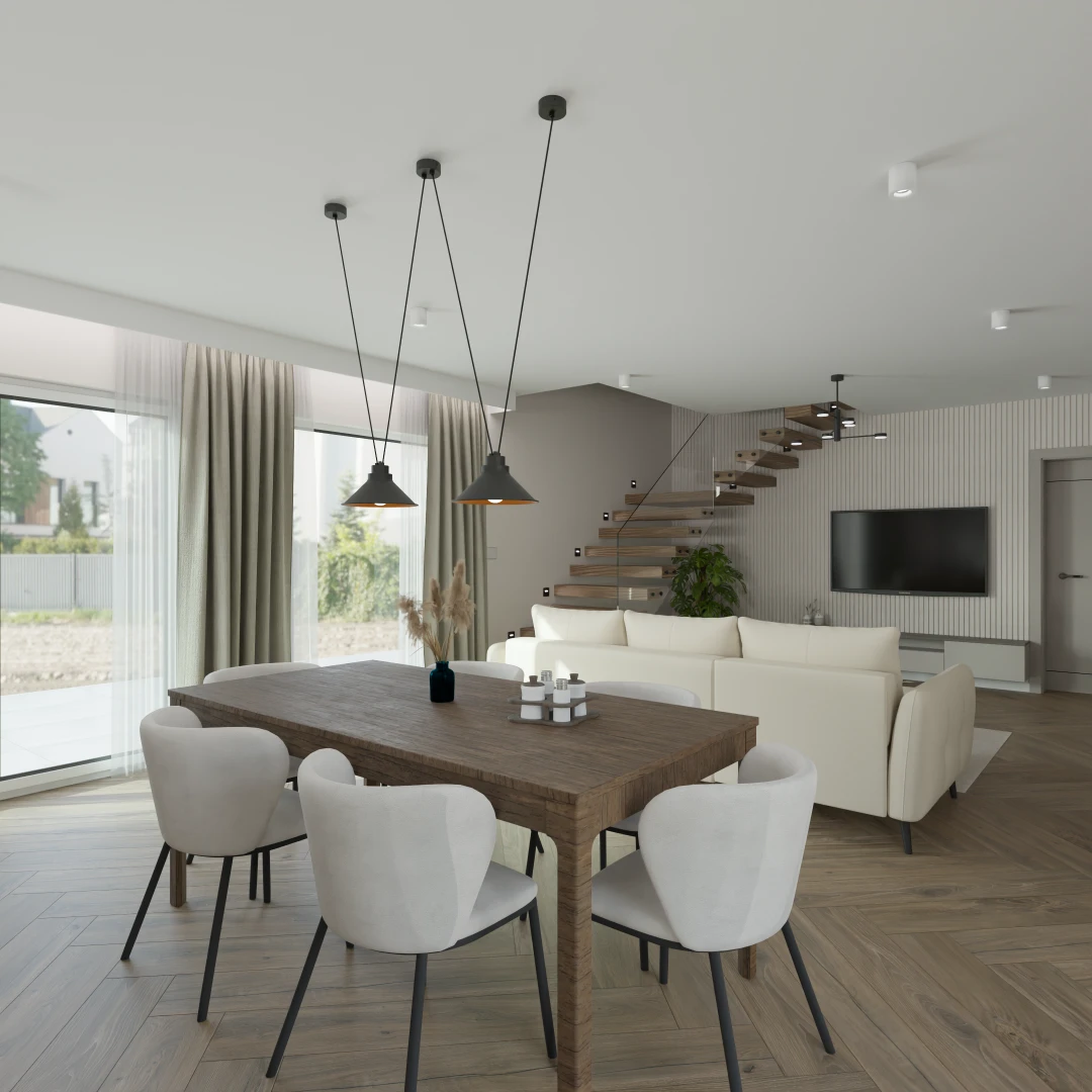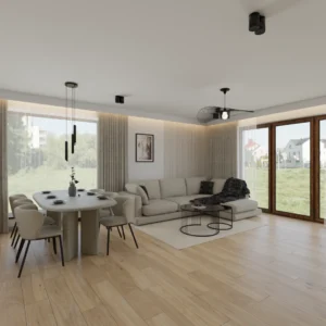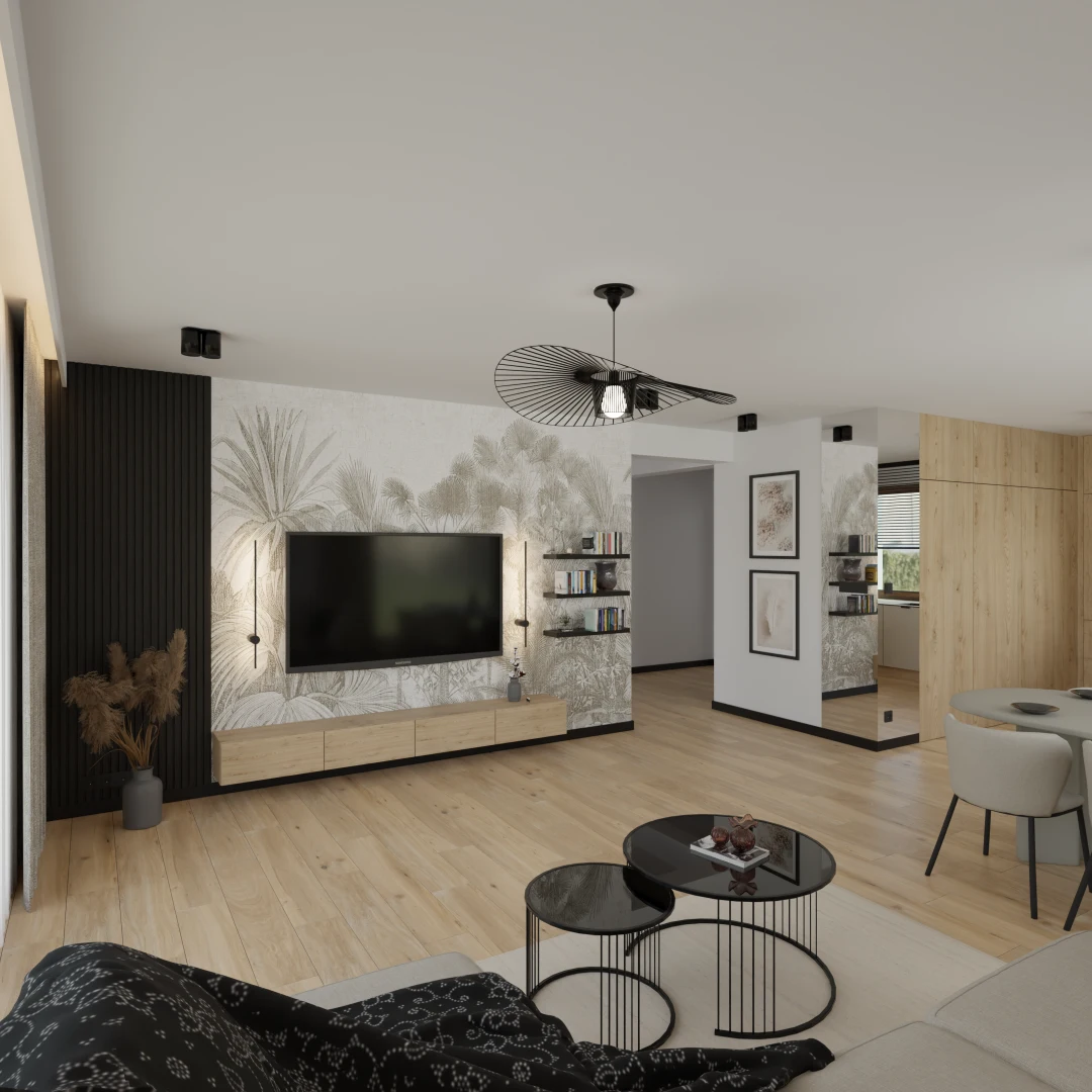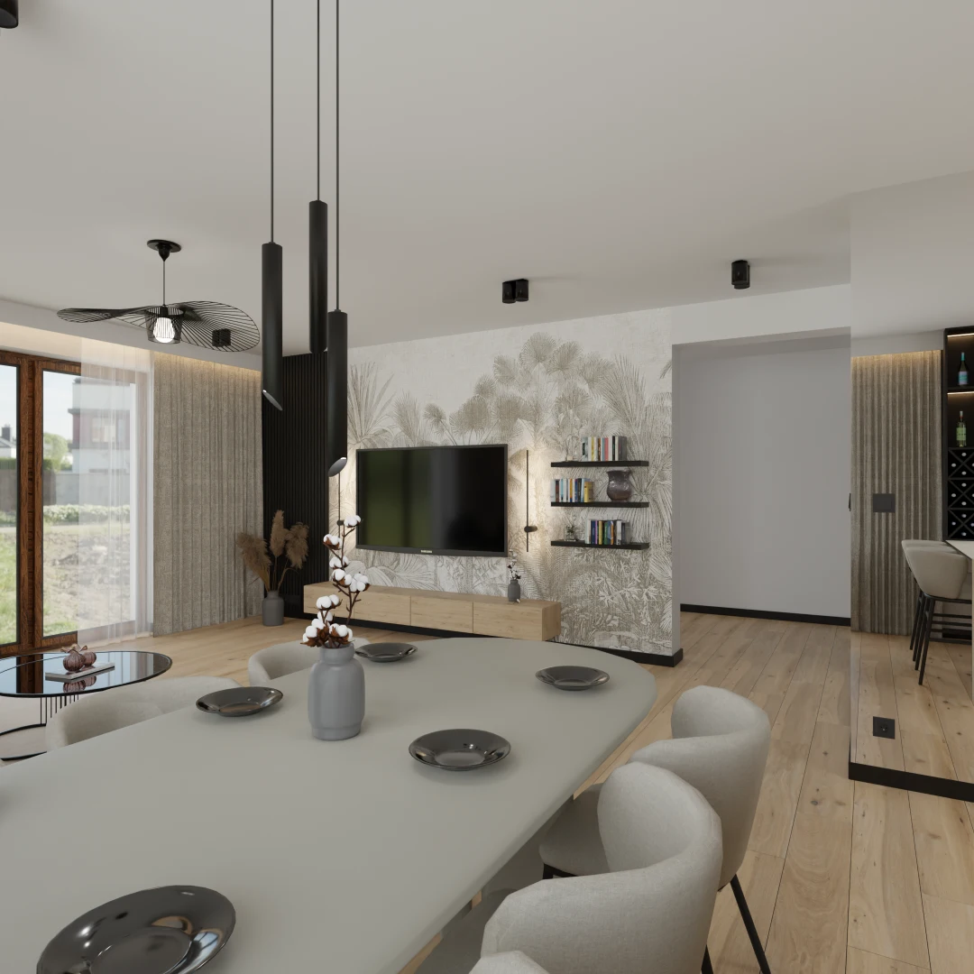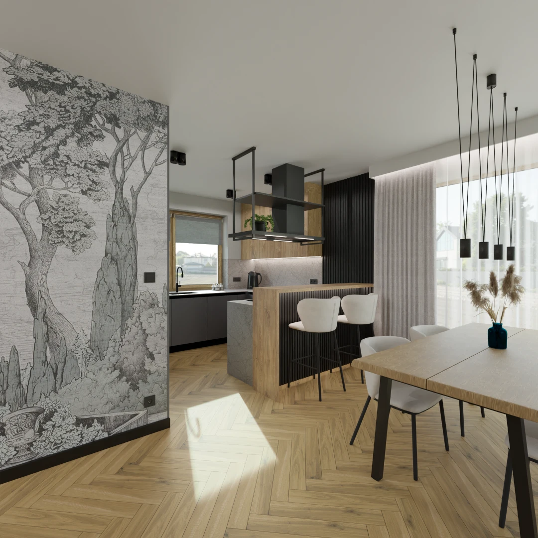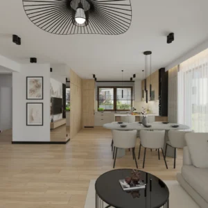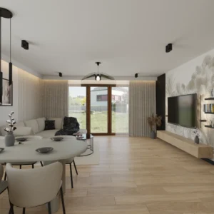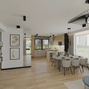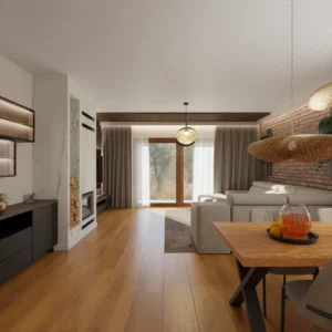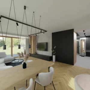 Projekt salonu z jadalnią z pozostawieniem istniejącej podłogi