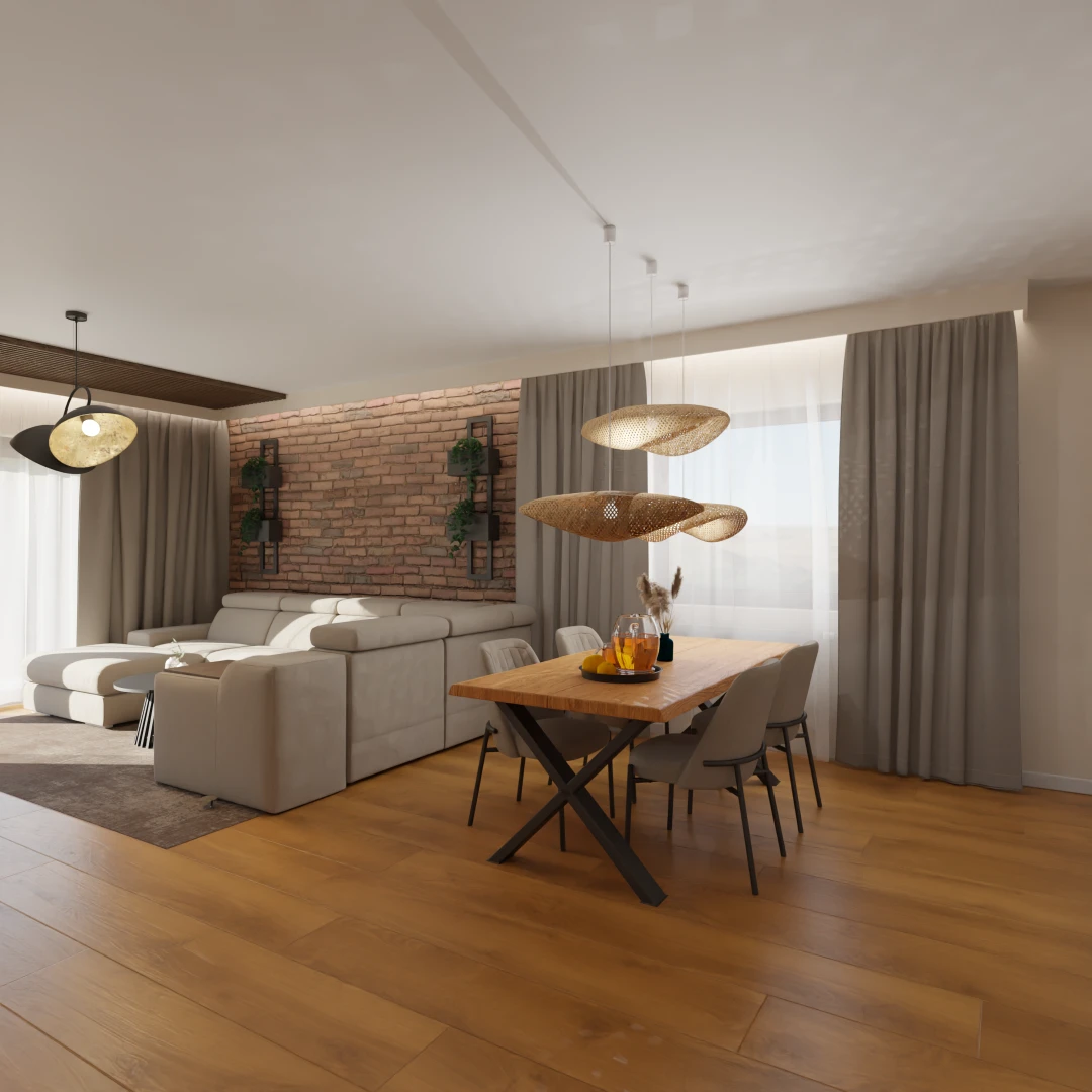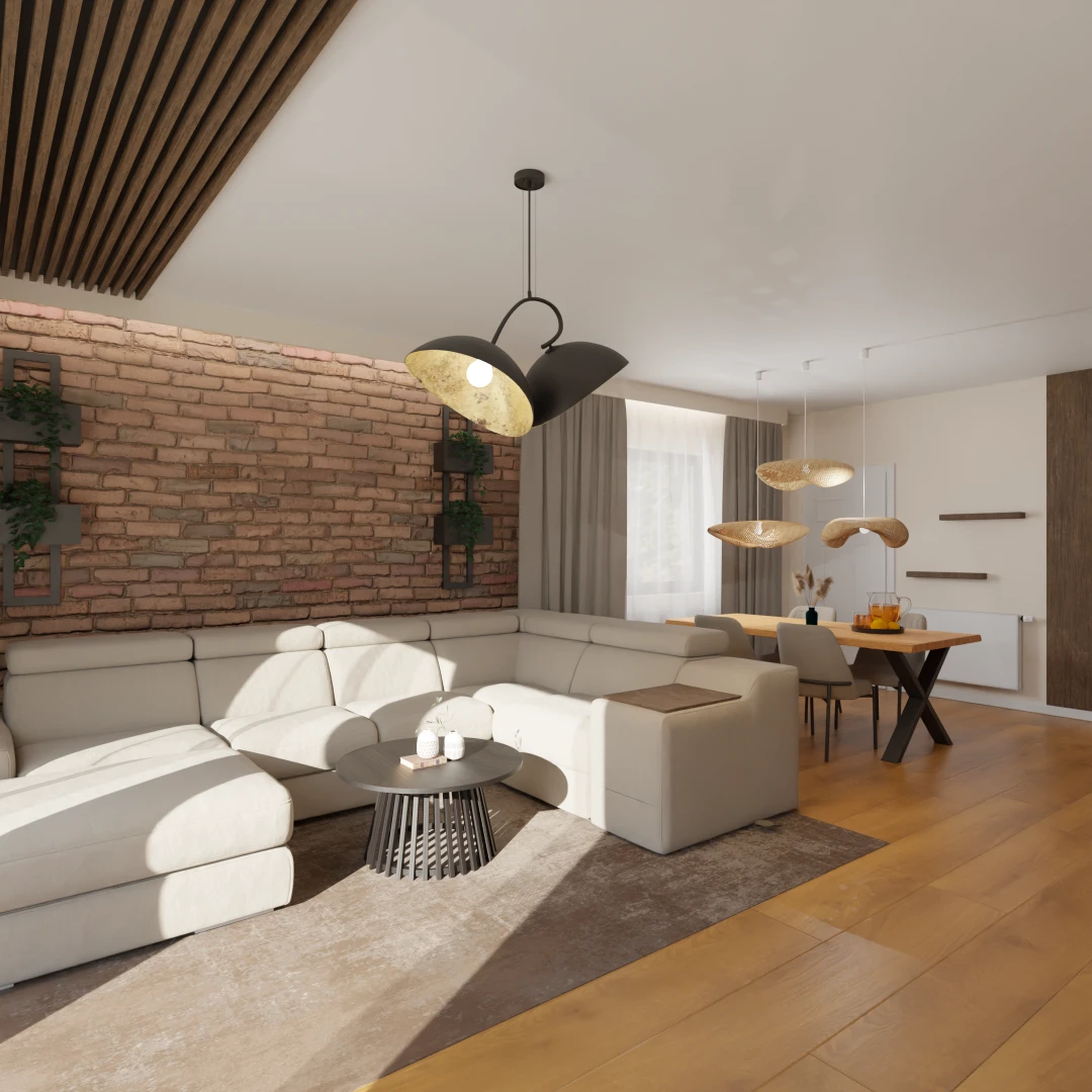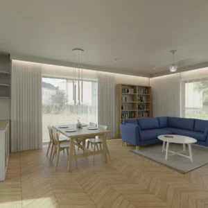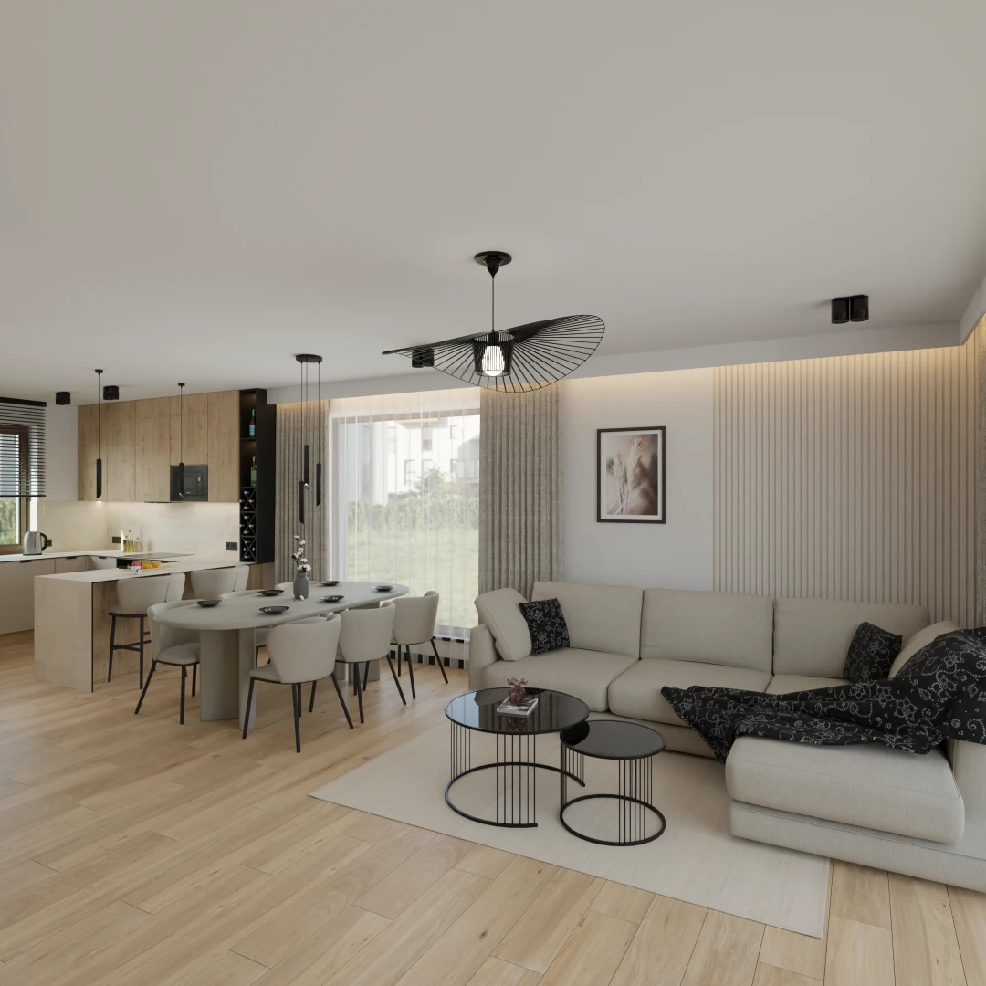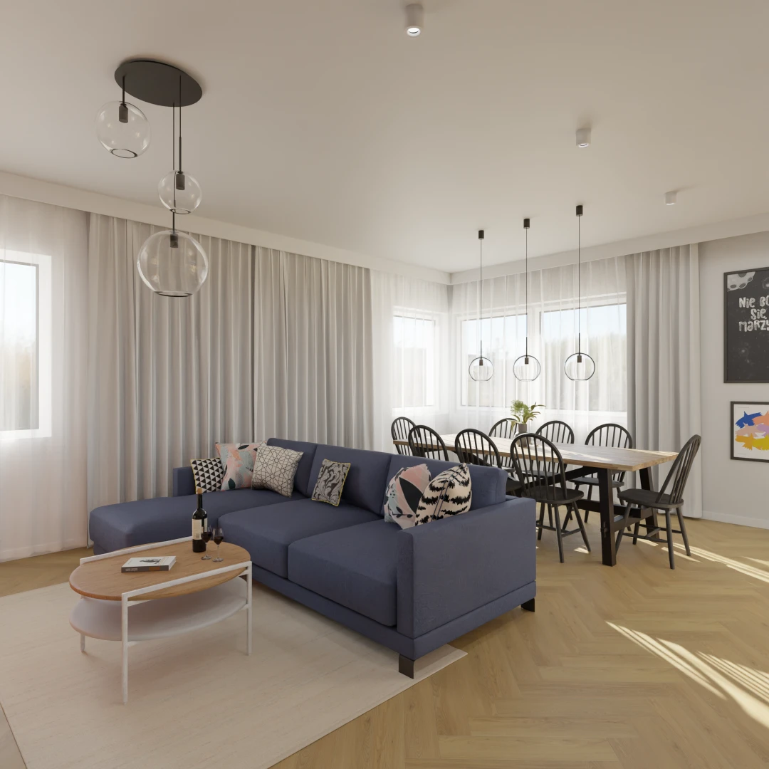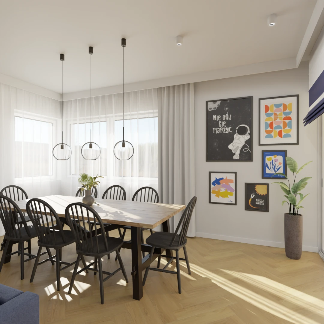 Projekt salonu z jadalnią z pozostawieniem istniejącej podłogi