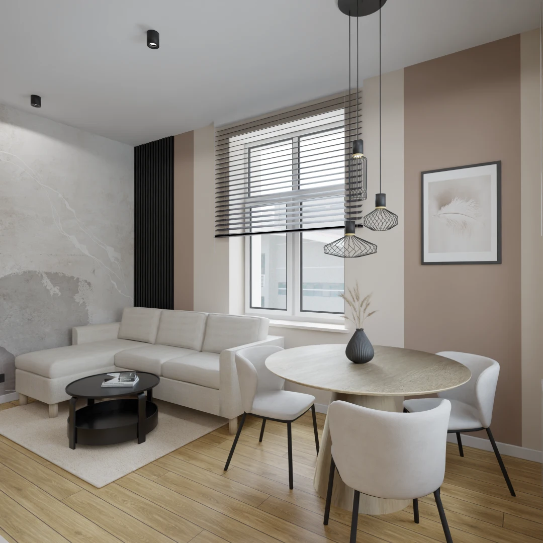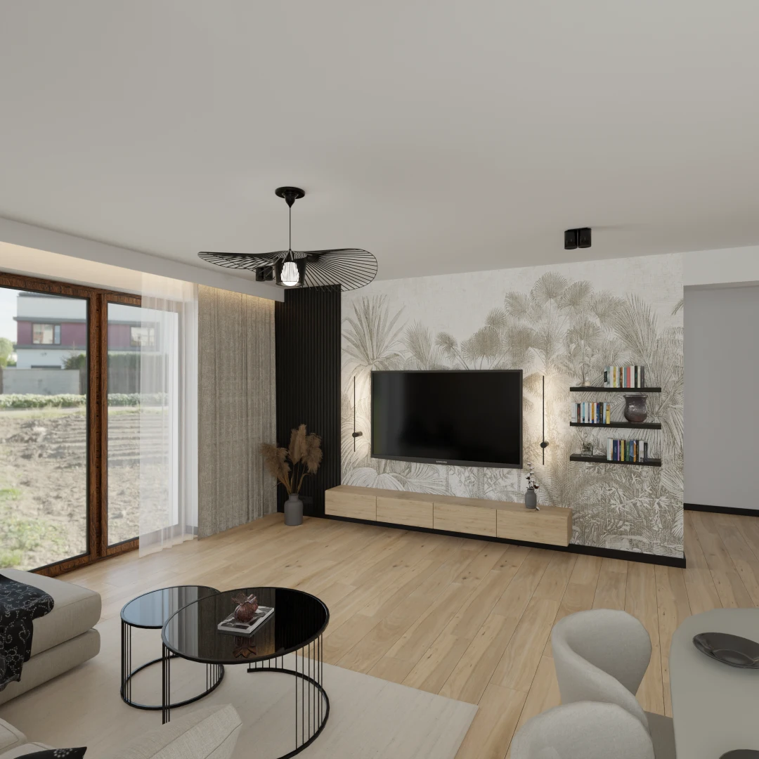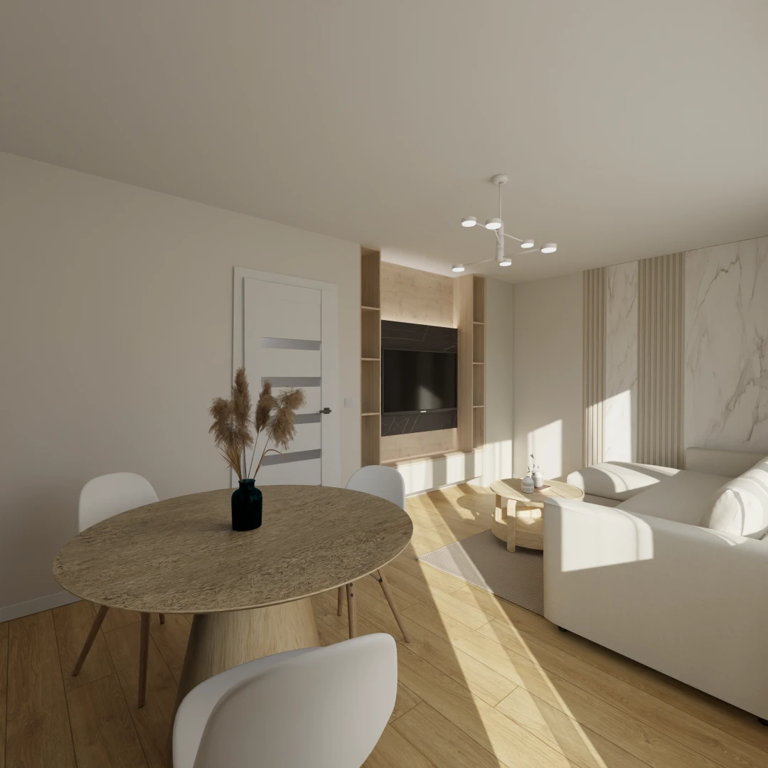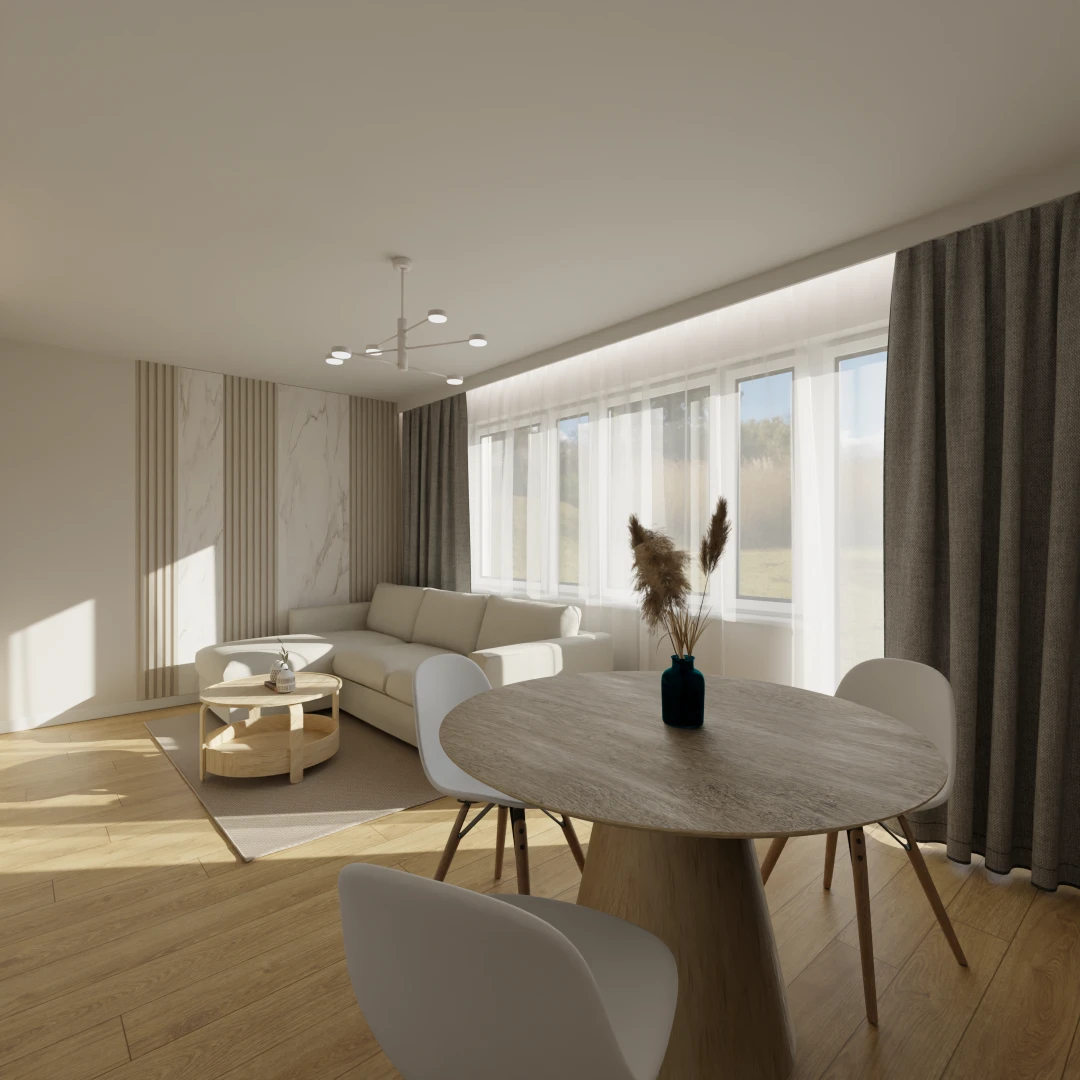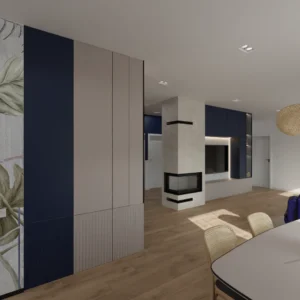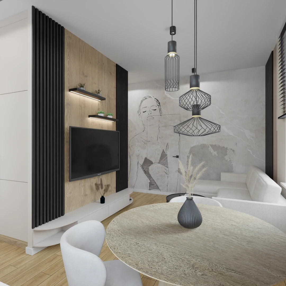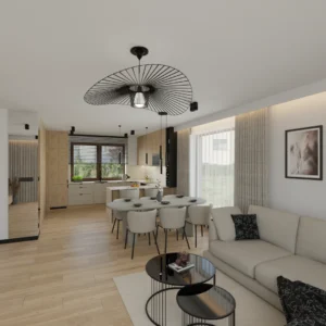 Projekt salonu z jadalnią z pozostawieniem istniejącej podłogi