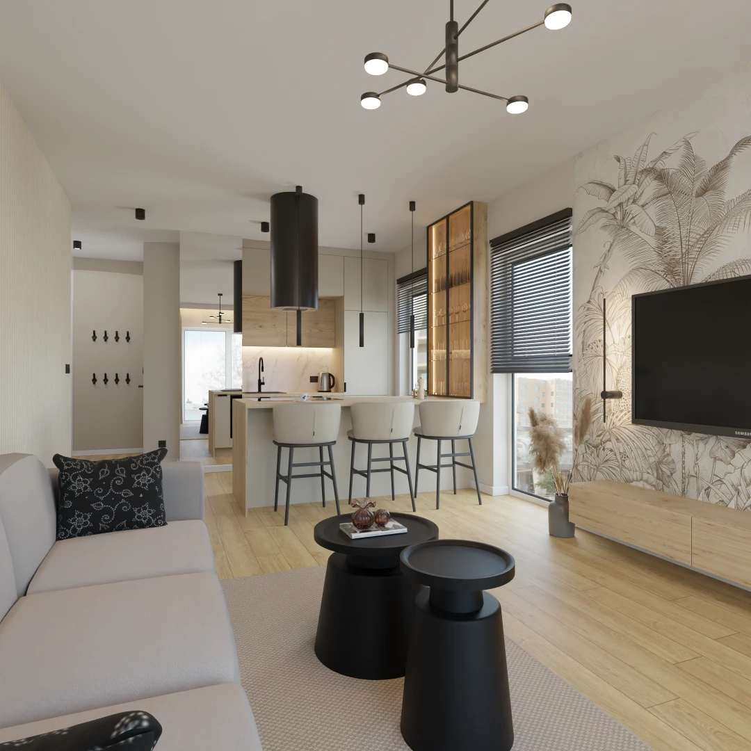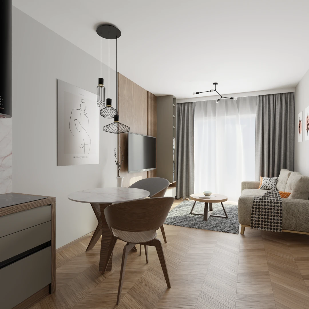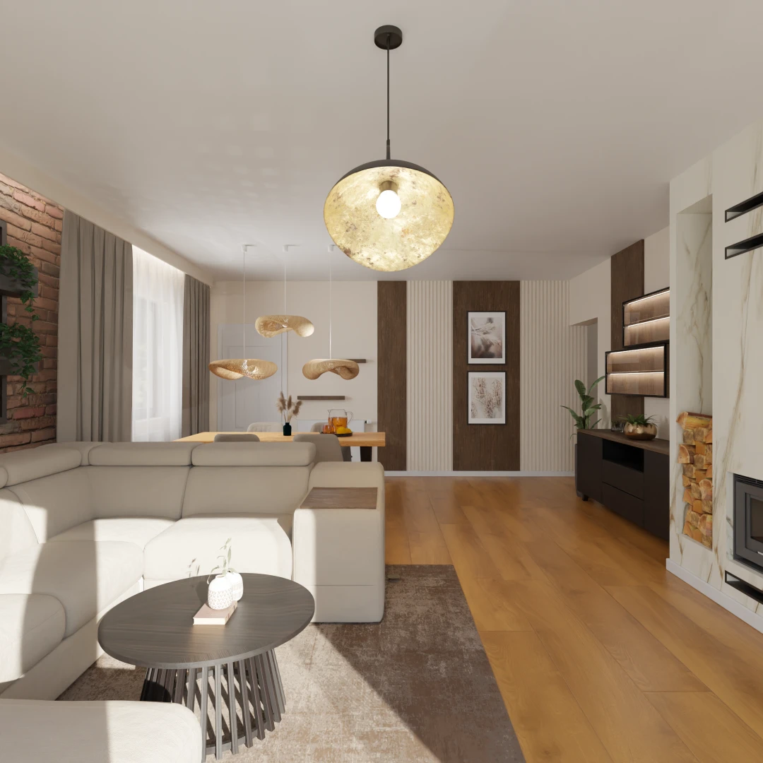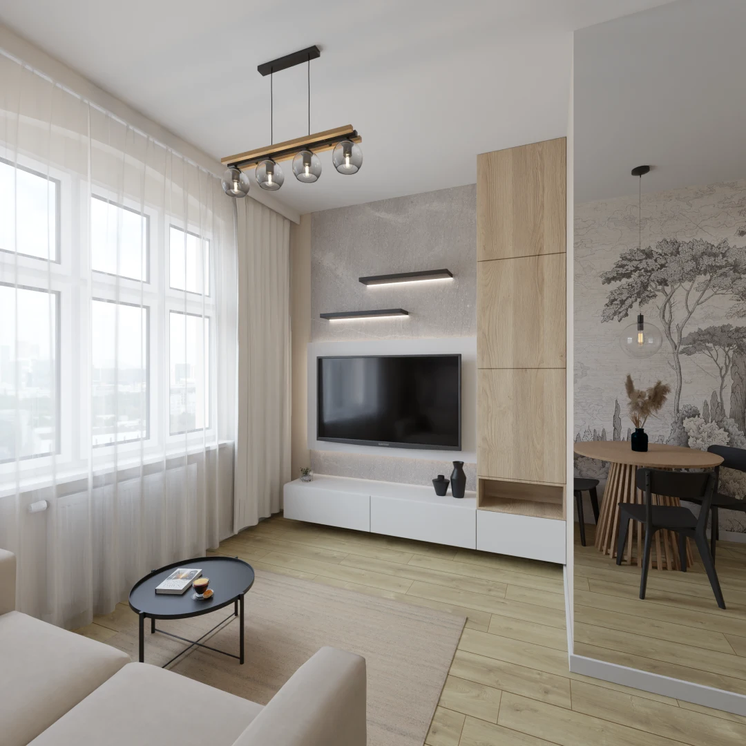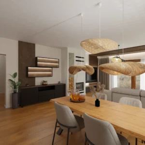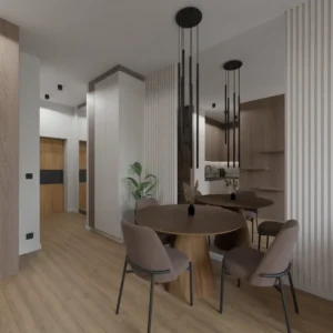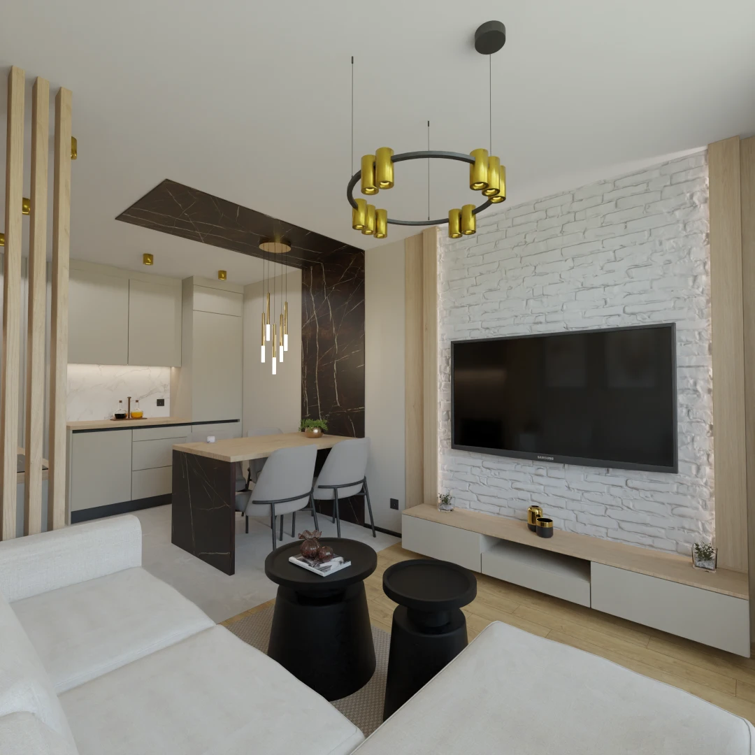 Projekt salonu z jadalnią z pozostawieniem istniejącej podłogi